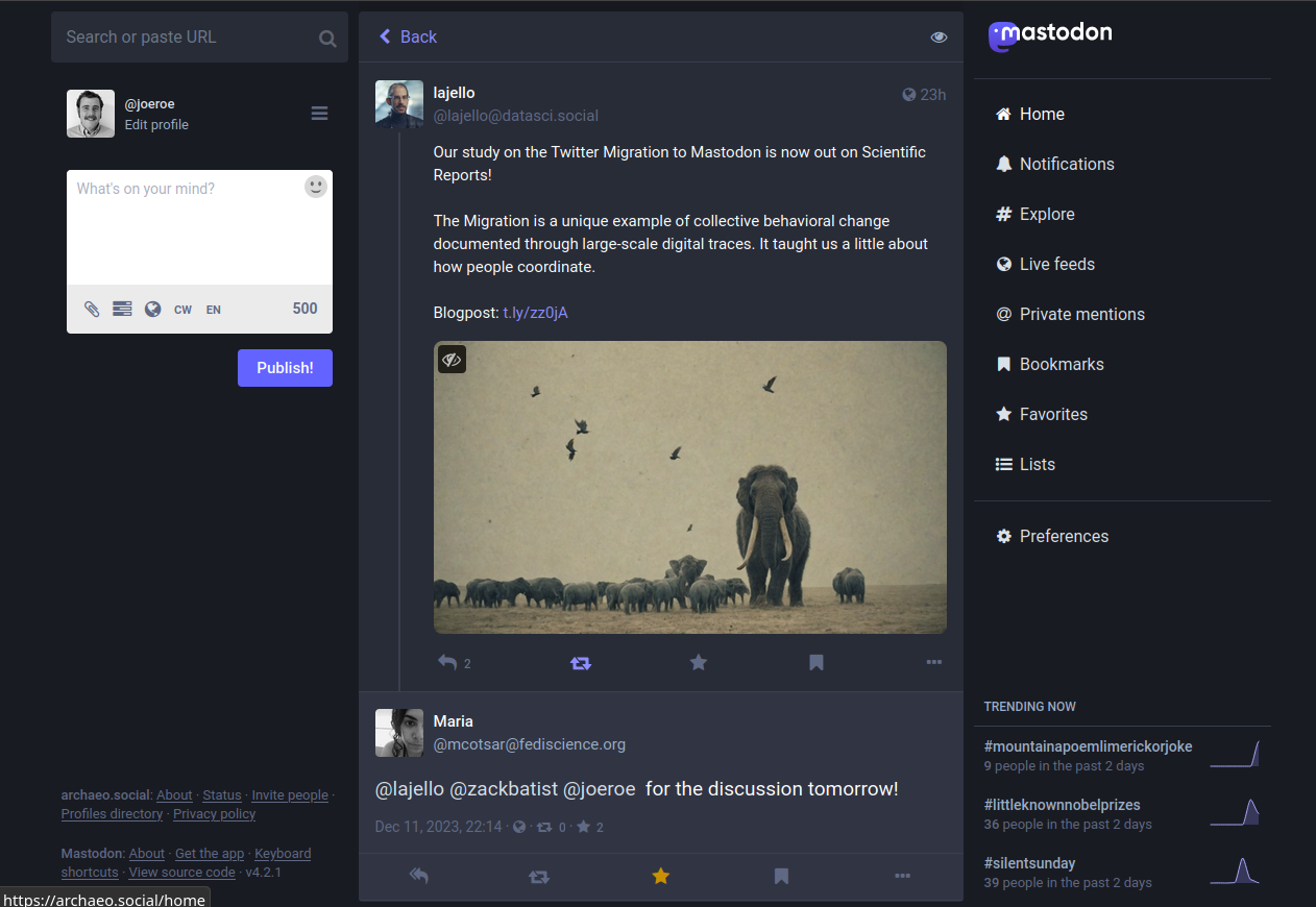 As with the early internet, scholarly organizations are at the forefront of developing and implementing a decentralized alternative to Twitter, Mastodon […] demonstrating that the scholarly community is capable of creating a truly public square for scholarly discourse, impervious to private takeover […]